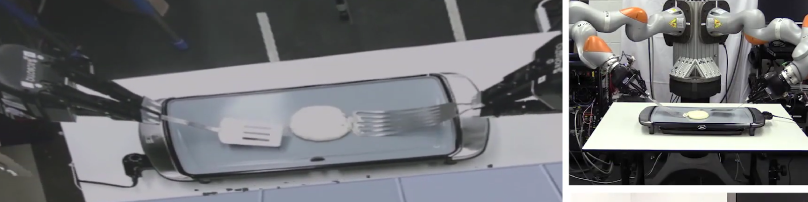 In the video, the top left of the screen displays the the robot’s point of view. The bottom left of the screen displays the video feed inside the Vive headset. The bottom right shows me, the user, driving the robot with the Vive handsets to cook the pancakes.